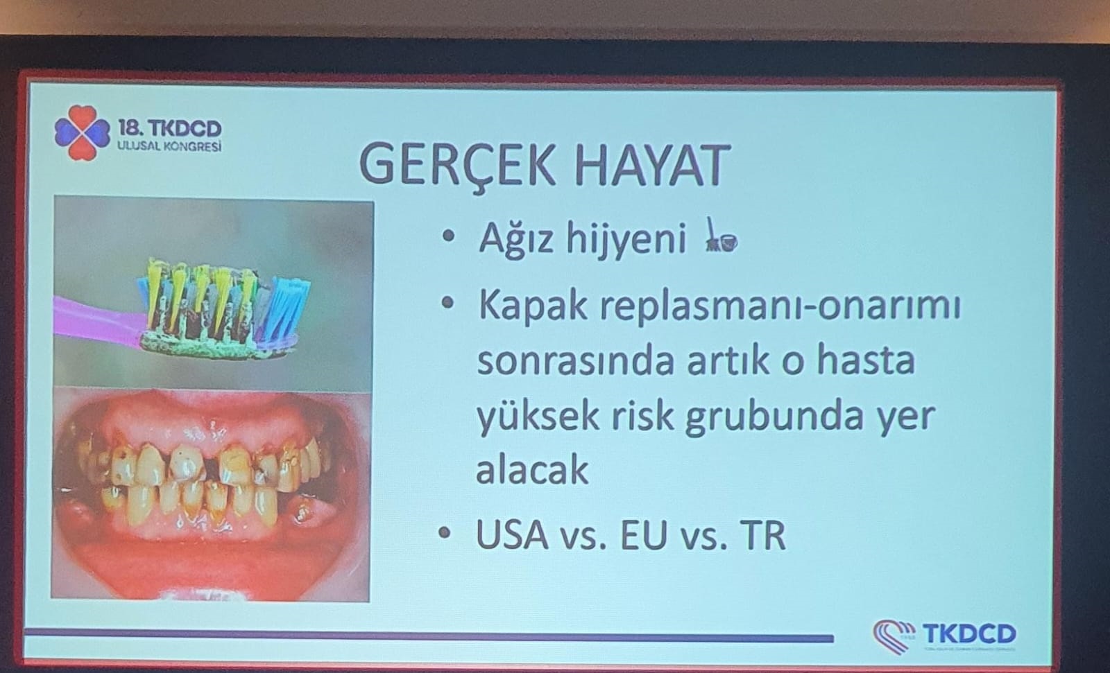 Türk Kalp ve Damar Cerrahisi Derneği (TKDCD) tarafından 21-24 Kasım tarihleri arasında Antalya’da düzenlenen 18’inci Türk Kalp ve Damar Cerrahisi Derneği Ulusal Kongresi’nde gerçekleştirilen bilimsel oturumlardan biri de kalp kapak hastalıklarının tedavisinde enfeksiyon riskleri ile ilgiliydi. Sunumu gerçekleştiren Selçuk Üniversitesi Tıp Fakültesi Kalp ve Damar Cerrahisi Anabilim Kısmı’ndan Doç. Dr. Ömer Faruk Çiçek, ağız hijyeninin kalp kapak ameliyatlarına tesirini anlattı. Doç. Dr. Çiçek’in sunumu sırasında tedavi ettiği olaylardan birine ait çarpıcı bir fotoğraf paylaştı. Çok çok önemli açıklamalarda bulunan Doç. Dr. Çiçek, ağız hijyeninde sınıfta kaldığımıza işaret etti.