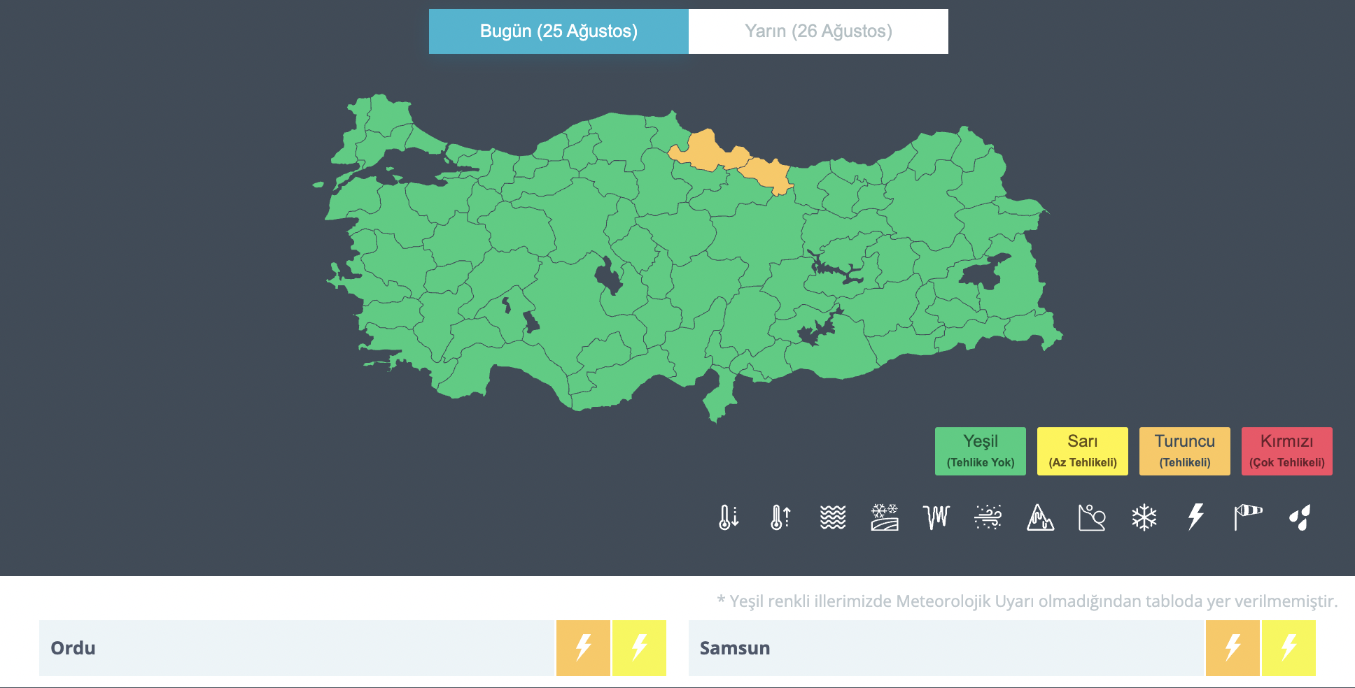 Meteoroloji Genel Müdürlüğü’nden alınan bilgiye göre Giresun, Trabzon, Rize, Artvin, Sivas, Kayseri, Aksaray, Niğde, Adana, Osmaniye ve Mersin‘de yağış uyarısı sonlandırıldı. Samsun ve Ordu‘da ise turuncu yağış ikazının sabah st 08:00’e kadar devam etmesinin beklendiği vurgulandı.