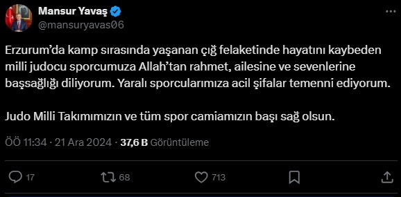 Ankara Büyükşehir Belediye (ABB) Başkanı Mansur Yavaş, “Erzurum’da kamp sırasında yaşanan çığ felaketinde hayatını kaybeden milli judocu atletimize Allah’tan rahmet, ailesine ve sevenlerine başsağlığı diliyorum. Yaralı atletlerimize acil şifalar temenni ediyorum” dedi.