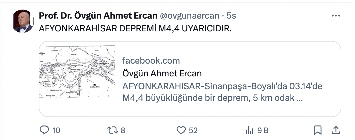 Afyonkarahisar’ın merkezinde st 03.14 sıralarında 4.4 büyüklüğünde bir sarsıntı yaşandı. Söz konusu sarsıntının akabinde Jeofizik Mühendisi Prof. Dr. Övgün Ahmet Ercan, hususa ilişkin bir açıklama yayımladı.