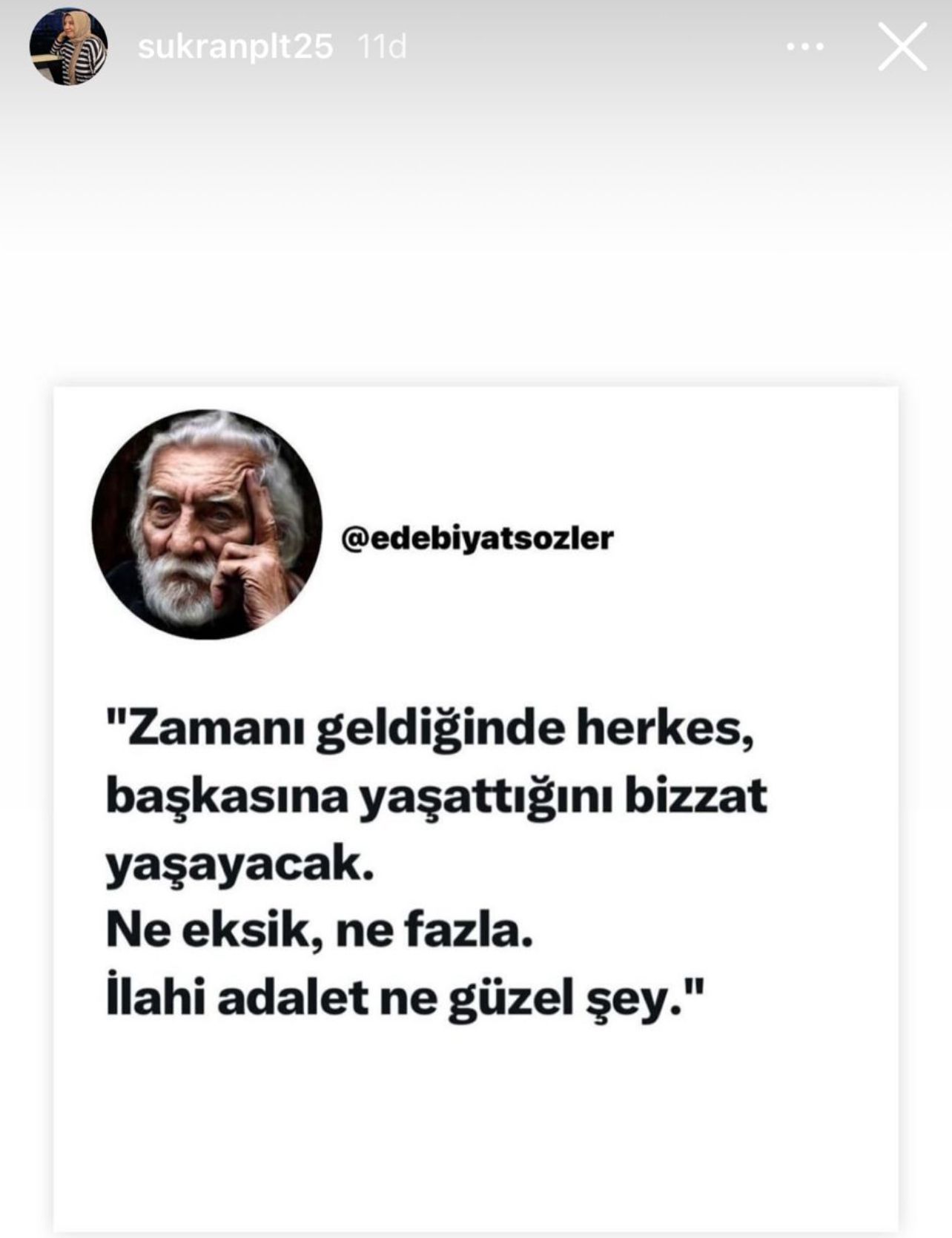 Kayınvalide Şükran Polat da tahliye haberini “Şükürler olsun” notuyla paylaştı. Şükran Polat ayrıyeten sosyal medya hesabından “ilahi adalet” vurgulu bir paylaşımda bulundu.