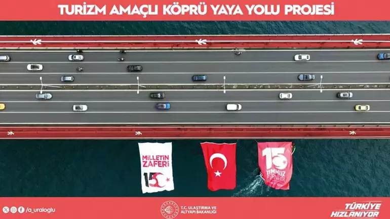 Ulaştırma Bakanlığı, turistik bir proje olarak 15 Temmuz Şehitler Köprüsü’nün yaya trafiğine açılmasını tartışıyor. Ulaştırma Bakanlığı fikir aşamasındaki projeyi görselle tanıttı. Amerika’daki Golden Gate ve Brooklyn Köprüsü’nde uygulanan yaya geçişi örnek alındı.